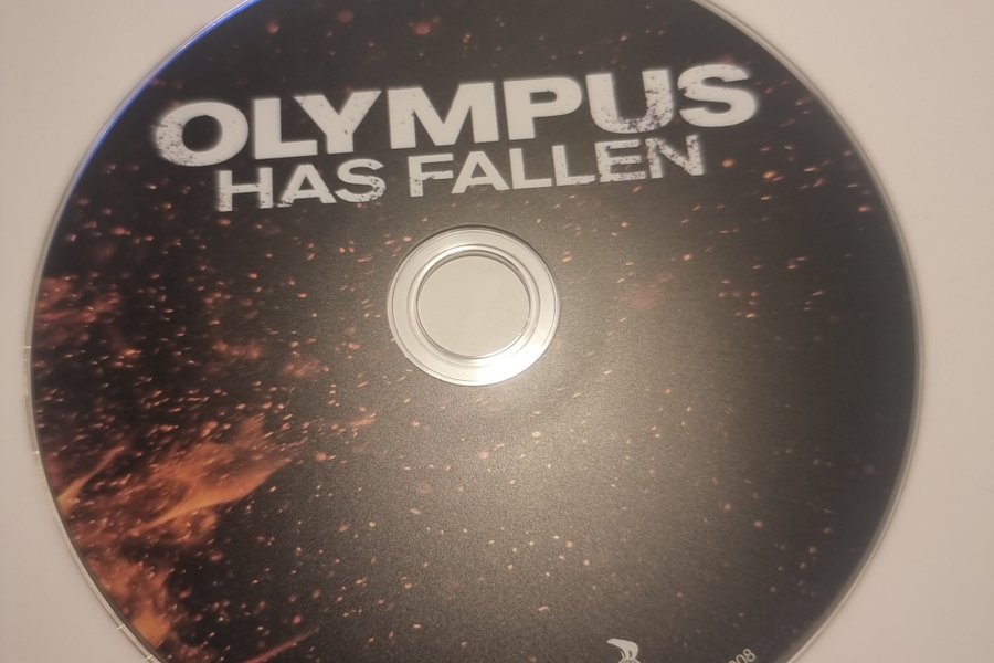 Texten "OLYMPUS HAS FALLEN" är framträdande på skivan.