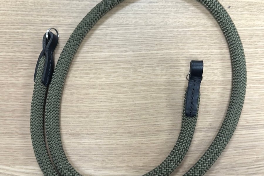En grön kamerarem med läderdetaljer.