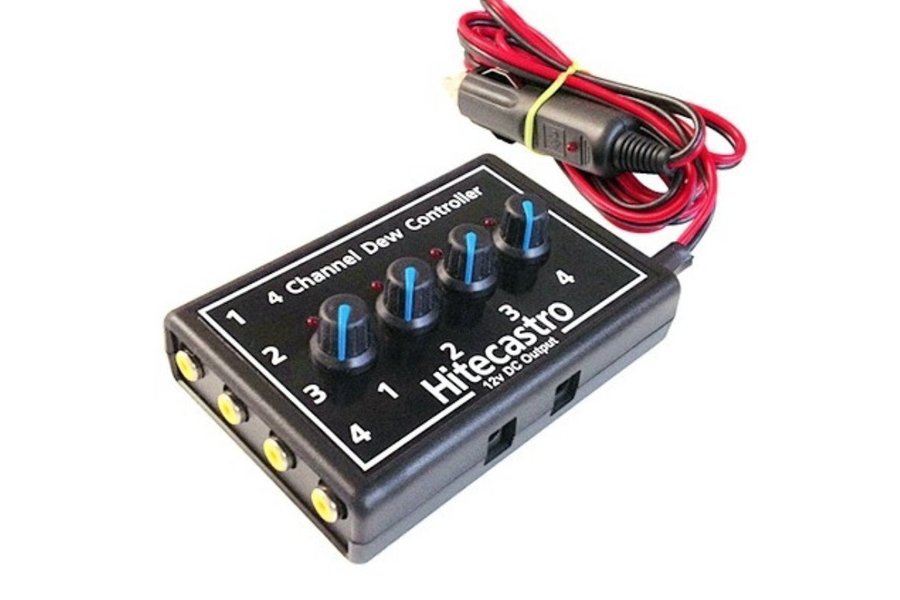 Hitecastro 4 channel dew controller Power controller for anti-dew collars With this useful device, you can control up to 4 heat collars individually. Voltage: 12V DC max. current per channel: 2 A.