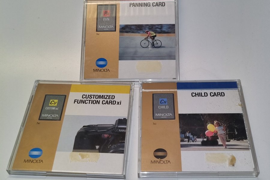 Tre stycken programkort till Minolta 7xi kameran. Inkluderar Panning Card, Customized Function Card xi och Child Card.