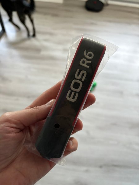 Kamerarem med texten "EOS R6" i vitt på svart bakgrund med röda kanter. Remmen är förpackad i plast. NY!