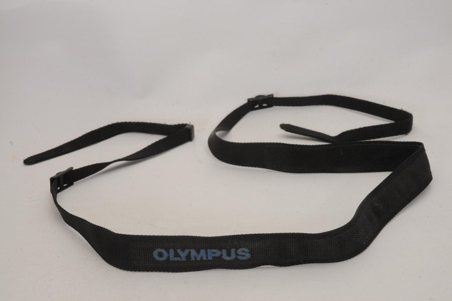 Svart kamerarem från Olympus. Remmen har justerbara spännen och en bredare, vadderad del för ökad komfort runt nacken eller axeln. Olympus-logotypen är tryckt i blått på den bredare delen av remmen.