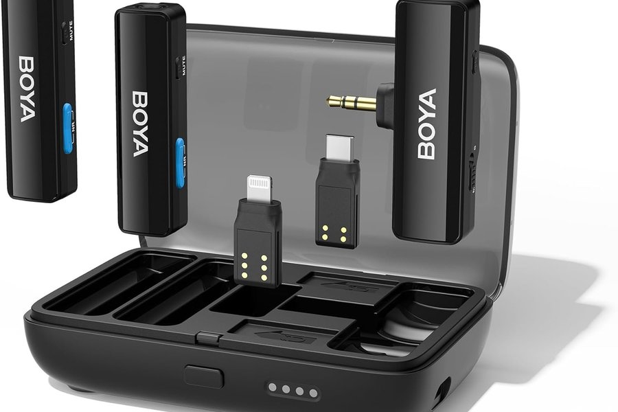 BOYA trådlöst mikrofonsystem med två sändare och en mottagare. Systemet inkluderar adaptrar för Lightning, USB-C och 3,5 mm TRS-anslutning, vilket gör det kompatibelt med en rad olika enheter som smartphones, surfplattor och kameror. Sändarna har inbyggda mikrofoner och funktioner för brusreducering (NR) samt mute-knapp. Mottagaren är kompakt och ansluts direkt till inspelningsenheten. Laddningsfodralet fungerar även som förvaring och har indikatorlampor för batteristatus.