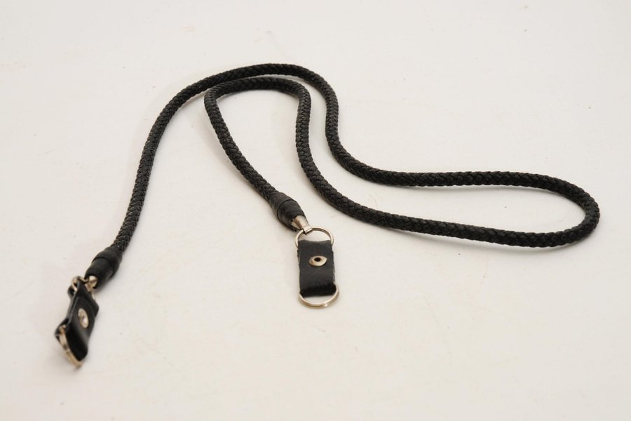 Svart kamerarem i flätat utförande med läderdetaljer och fästen i metall.