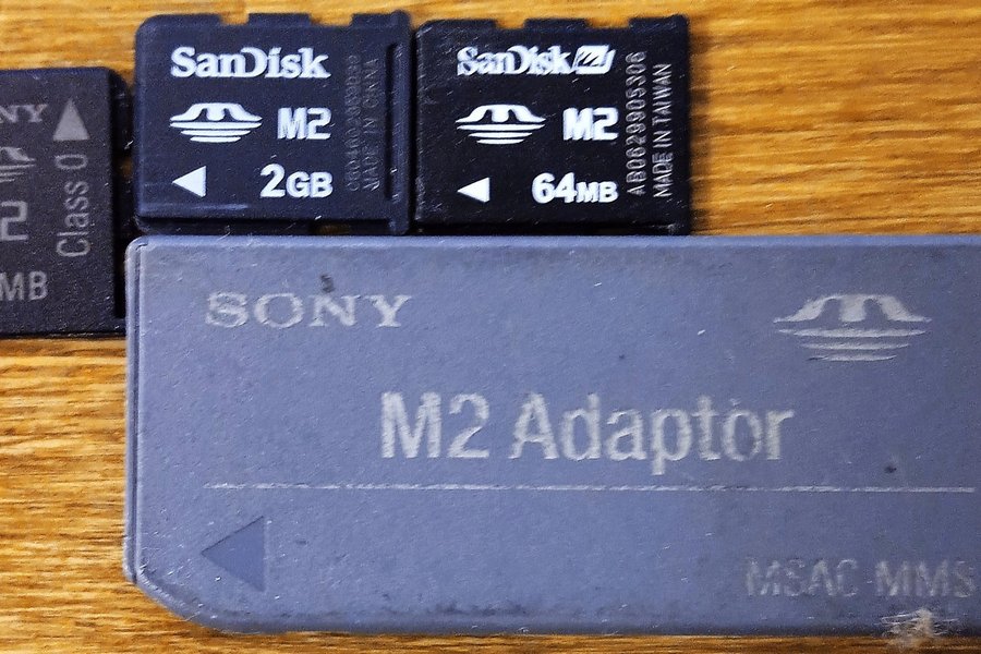 Innehåller Sony och SanDisk M2 minneskort. Kapacitet: 64MB, 64MB och 2GB. Inkluderar även en Sony M2 adapter.