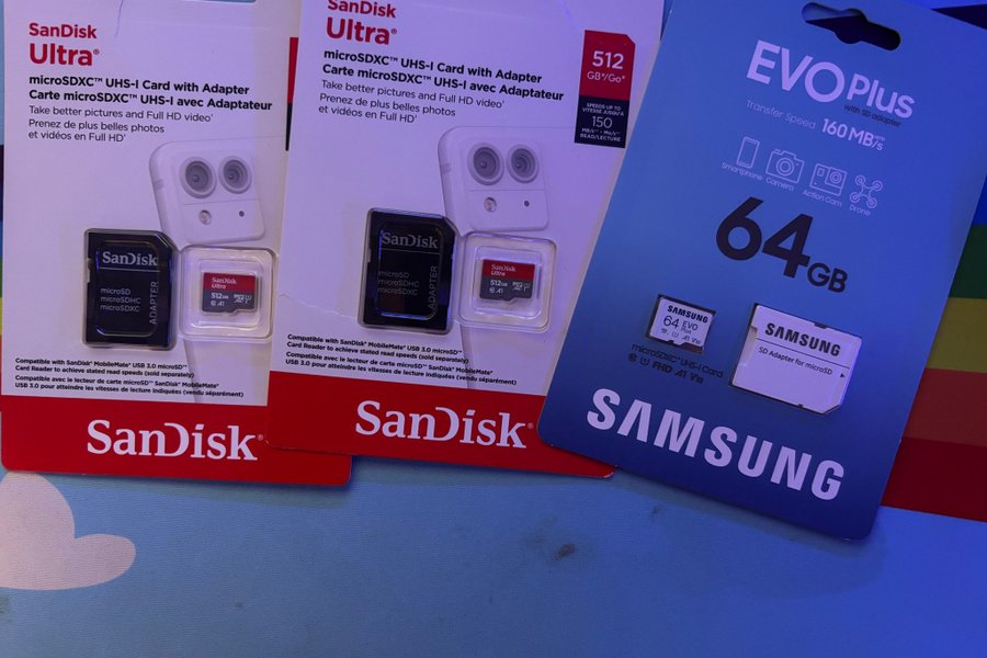 MicroSD-kort: SanDisk Ultra 512GB, SanDisk Ultra och Samsung EVO Plus 64GB med SD-adapter.