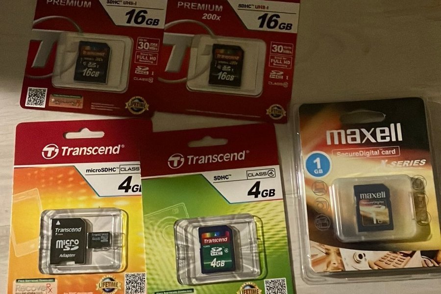 Allt på bilden. Oöppnade förpackningar. Blandade minneskort innehållande: