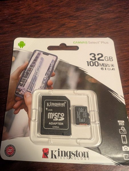 Kingston Canvas Select Plus MicroSD-kort med 32GB lagringskapacitet. Adaptern ingår.