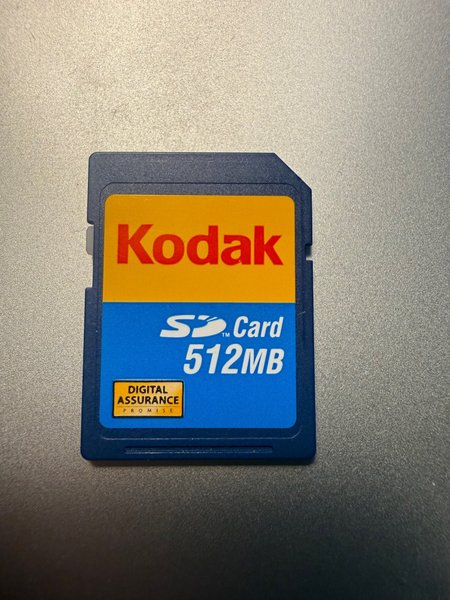 SD-kort från Kodak med en lagringskapacitet på 512 MB. Kortet är blått med en gul och röd etikett med Kodak-logotypen och texten "SD Card 512MB". Det finns även en mindre gul ruta med texten "DIGITAL ASSURANCE PROMISE".