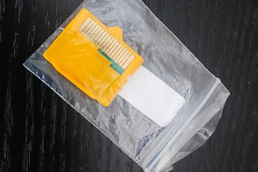 Minneskortsadapter för elektroniska enheter. Adaptern är gul och har synliga kontakter. Den levereras i en transparent plastpåse.