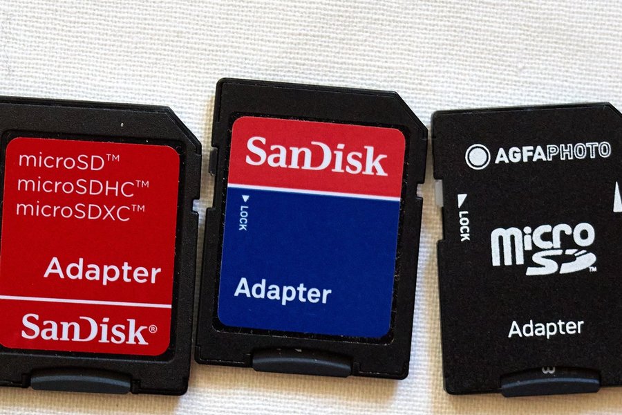 Tre MicroSD-adaptrar. En adapter är från AGFA PHOTO och två är från SanDisk. Adaptrarna är kompatibla med microSD, microSDHC och microSDXC.