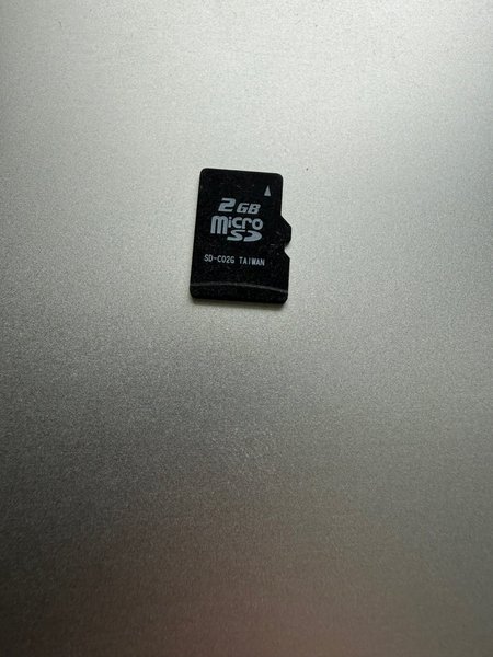Micro SD-kort med en lagringskapacitet på 2 GB. Modellen är SD-C02G och tillverkad i Taiwan.