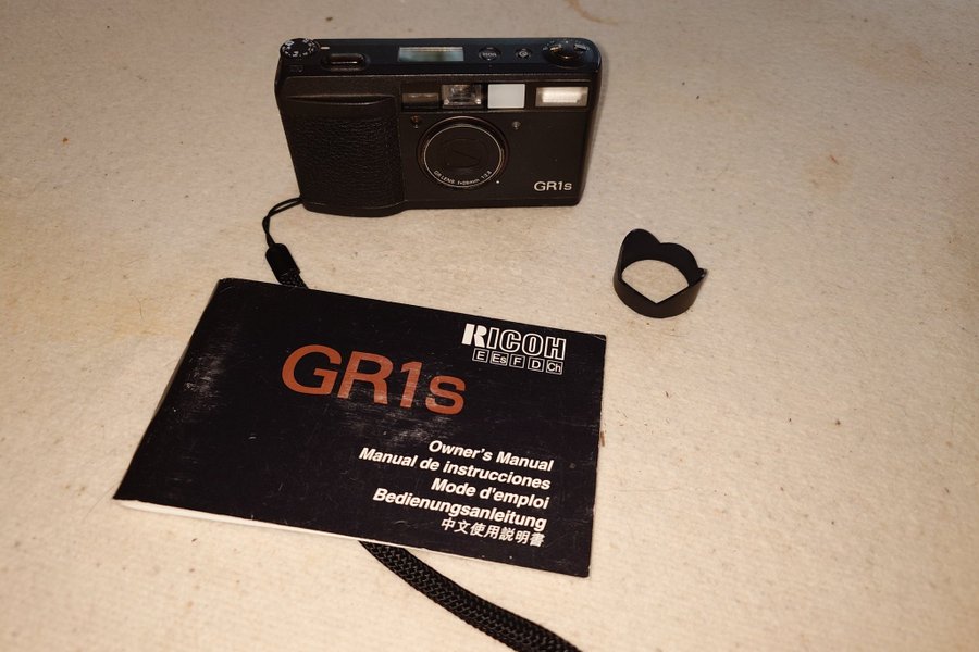 Ricoh GR1s kamera med tillbehör och manual. En klassik analog kamera med klassika fel. Displayen saknar en del tecken. Men i övrigt fungerar den.