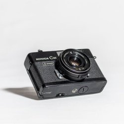 Kamera av märket Konica, modell C35. Kameran är utrustad med ett Hexanon 1:2.8 f=38mm objektiv. Den har en automatisk exponeringsfunktion.