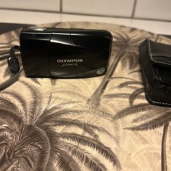 Kompaktkamera från Olympus. Kameran har en zoomlins på 38-80 mm och är märkt med ”ALL WEATHER”.