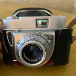 Beier kamera i originalförpackning med tillhörande läderfodral.