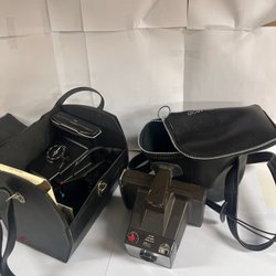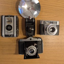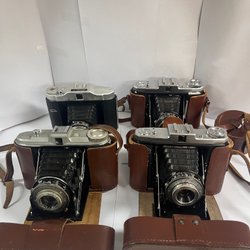 En samling av äldre kameror. Inkluderar bland annat en Dehel kamera tillverkad i Frankrike och en kamera med tillhörande läderväska. Samt en Kodak EK2 och Polaroid Swinger med originalkartong.