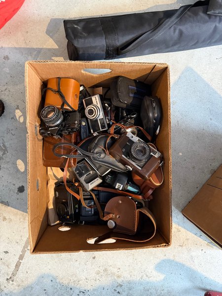 En banankartong med diverse analoga kameror. Jag har inte testat alla så vissa kanske behöver servas men de flesta ska nog funka. Säljes i befintligt skick