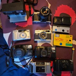 Här är en samling av kameror. Inkluderar en Pentax Espio 928, en Agfamatic 200 sensor, en Hanimex VEF och en Kodak kamera. En Minolta blixt ingår också. Ej testade.