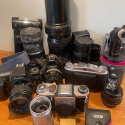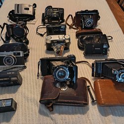 Samling av kameror inklusive Polaroid 300, Sony digitalkamera, Canon PowerShot A60 (2.0 megapixels), Canon PowerShot 350 digitalkamera, Fujifilm FinePix (8.3 mega), Olympus digitalkamera C-765 Ultra Zoom (4.0 megapixel), Canon Digital IXUS 55 (5.0 mega) och Escape HD5W.