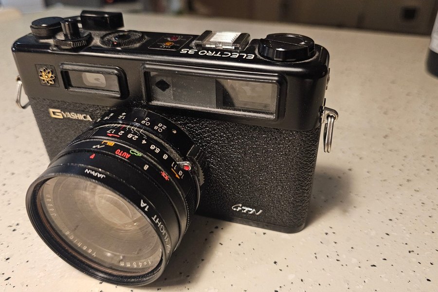 Klassisk Yashica Electro 35 kamera. Denna kamera är en 35mm avståndsmätarkamera med en fast 45mm lins.