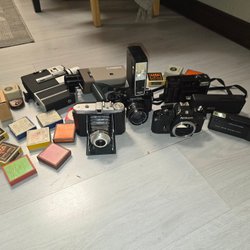 Tre kameror med tillhörande objektiv. Kamerans slutare och filmmatningsspak verkar fungera. Övriga funktioner okända. Objektivets funktion är inte testad. Säljs i befintligt skick.