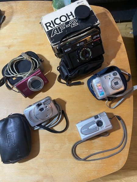 Parti med 5 kameror. En Ricoh AF-2 med tillhörande fodral och en trasig låda, en Canon PowerShot SX200 med fodral och överföringskabel som fungerar, en Nikon Coolpix 3200 med fodral, en Fujifilm A202 med ett Konicafodral och överföringskabel som fungerar, och en Avant DC330 digital.