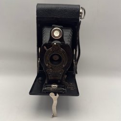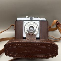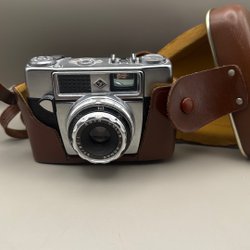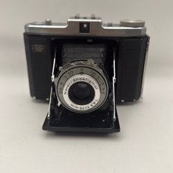 Klimax kamera i svart och silver. Kameran har en rem för enkel hantering. Den har en lins med justerbara inställningar och en blixtsko på ovansidan. Kameran har också en filmspolare och en avtryckarknapp. Läderimitationen på kroppen har släppt på sina ställen annars i fint visuellt skick. Dock EJ funktionstestad. Säljes som prydnad.