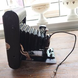Kamera med bälg. Kameran har en svart exteriör och en rem. Den har en front med en lins och en mekanism för att fälla ut bälgen. Baksidan är slät med en liten röd cirkel. Kameran har en metallisk spärr på sidan. Visuellt i gott skick. Ej funktionstestad, säljs som prydnad.