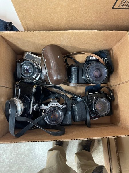 Denna samling innehåller flera kameror, inklusive en Canon, en Pentax med ett SMC Pentax-M 1:1.7 50mm objektiv, en Topcon Tokyo Kogaku med serienummer 68030037, en Yashica och en kamera med ett Carl Zeiss Tessar-objektiv. Perfekt för den som uppskattar äldre kamerateknik. OBS texten är autogenererad. Det du ser på bilden är det du får. Priset avser allt på bilden. Kan hämtas på Södermalm eller i Gamla stan Stockholm. Skickas ej.