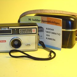 En äldre lådkamera klädd i svart texturerat material. Kameran har ett bärhandtag på ovansidan. Den är öppningsbar och visar den inre mekanismen för film.