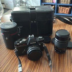 Klassisk Konica Autoreflex TC kamera med tillbehör. Inklusive teleobjektiv, en väska för objektivet, en kameraväska och en rem.