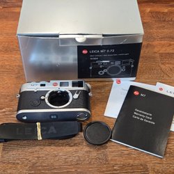 Analog kamera med svart kamerarem. Kameran är svart och silverfärgad med ett svart objektivlock.