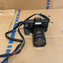 Analog systemkamera med ett Auto Chinon 1:1.7 f=55mm objektiv. Kameran har en svart finish och manuella inställningar för slutartid och bländare. Objektivet är avtagbart.