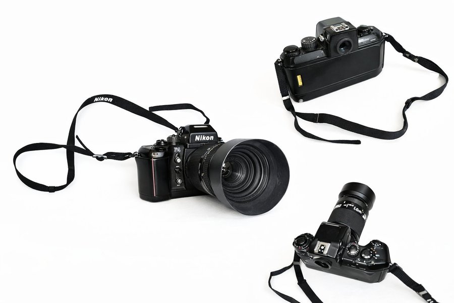 Nikon F4 systemkamera med objektiv och rem. Kameran är svart.