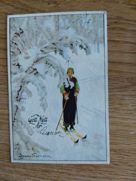 Ett vykort med motiv av en skidåkare i ett vinterlandskap. Konstnär: Jenny Nyström. Text: Gott Nytt År.
