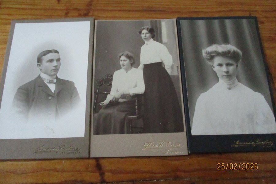 Tre fotografier från tidigt 1900-tal. Ett fotografi föreställer en man, ett föreställer två kvinnor och ett föreställer en kvinna. Alla tre fotografier är i svartvitt.
