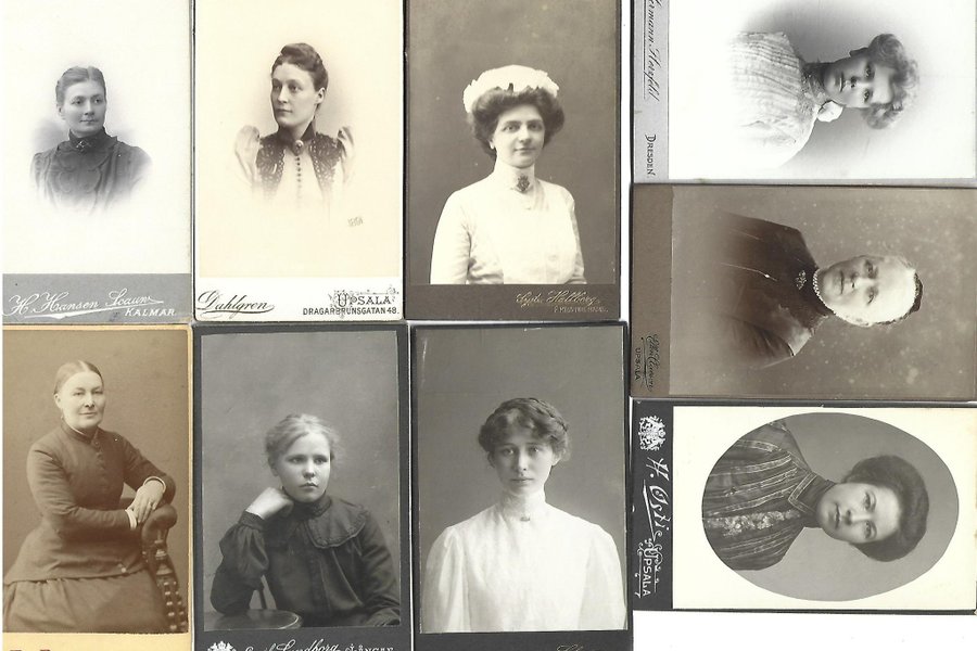 Svartvita fotografier med porträtt av kvinnor. Bilderna är tagna av olika fotografer