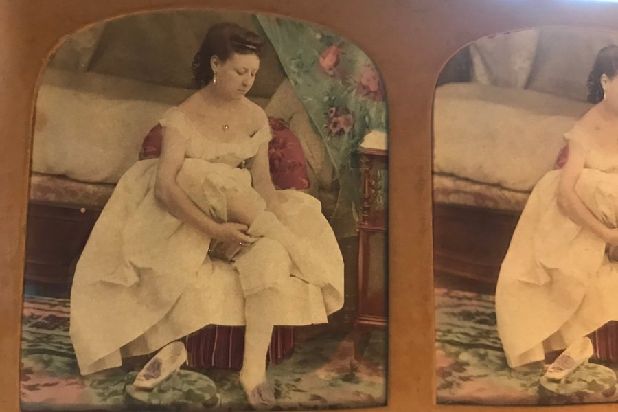 Stereoskopbild med en kvinna i en klänning som sitter på en säng. Bilden är i färg.