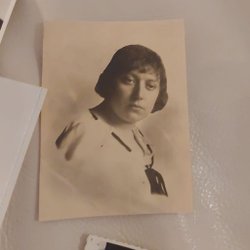 Fotografi av en kvinna i helfigur. Kvinnan bär en mörk klänning och ett halsband. Hon står bredvid ett litet bord. Bilden är svartvit. Fotot är märkt "Kehlet Amagertorv 17".Reimert Kehlet (1881–1949), var en av de mest framgångsrika porträttfotograferna i Köpenhamn under 1920-talet. Han är särskilt känd för att ha grundat den populära ateljékedjan Kehlet & Stella Nova, som på 1920-talet dominerade marknaden för porträttfotografering i Danmark med flera filialer.