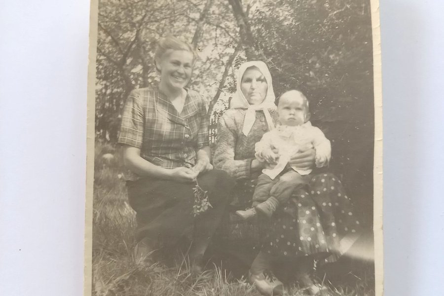 Ett svartvitt fotografi som föreställer tre personer utomhus. Två kvinnor och ett litet barn sitter på marken omgivna av gräs och träd. Kvinnan till vänster bär en rutig skjorta och ler. Kvinnan i mitten bär en huvudduk och håller barnet i famnen. Barnet är klätt i ljusa kläder och skor. Fotot har en matt yta och är i stående format.