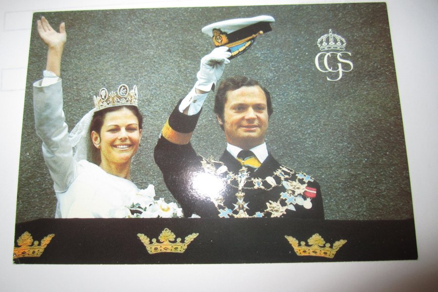 Fotografi föreställande kung Carl XVI Gustaf och drottning Silvia på sin bröllopsdag. Kungen bär sin uniform och drottningen bär en tiara och brudklänning. Bilden är tagen utomhus med en mörk bakgrund. Nedtill på bilden finns tre gyllene kronor.