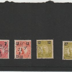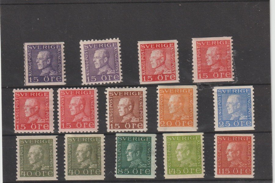 Ett parti med Gustav V profil vänster ostämplade. Ev. är några postfriska. Värde runt 1000 kr. beroende på nyans och papper.