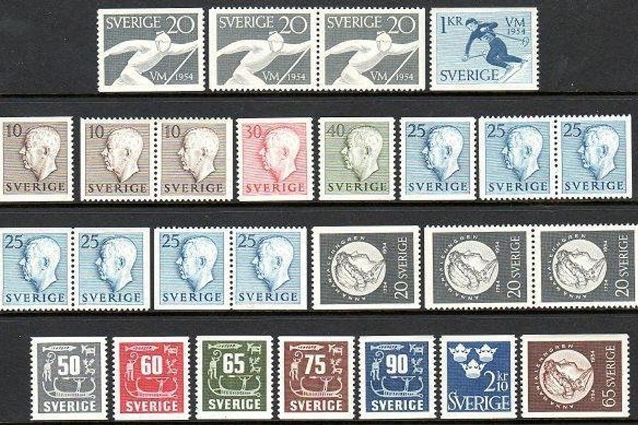 Komplett årssats med samtliga märken utgivna 1954 (F.454-457 inkl. bruksmärken).