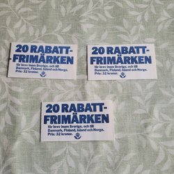 1 helt häfte rabattfrimärken om 20 stycken gäller i Sverigee