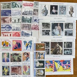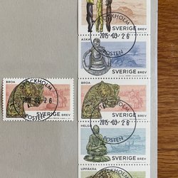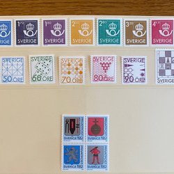 Sverige lågvalörer 2kr-3,50kr. Många dubbletter men också ett par serier. Ca 70 märken. Se bild.