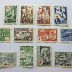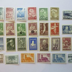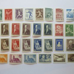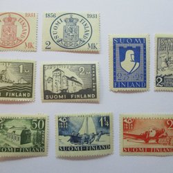 Olika utan gummering, monterat på papper, fast sättare, fuktskador.