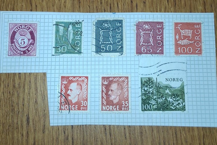 Frimärken . Norge . Frimärkena är fastlimmade på pappret . Köparen betalar frakten .