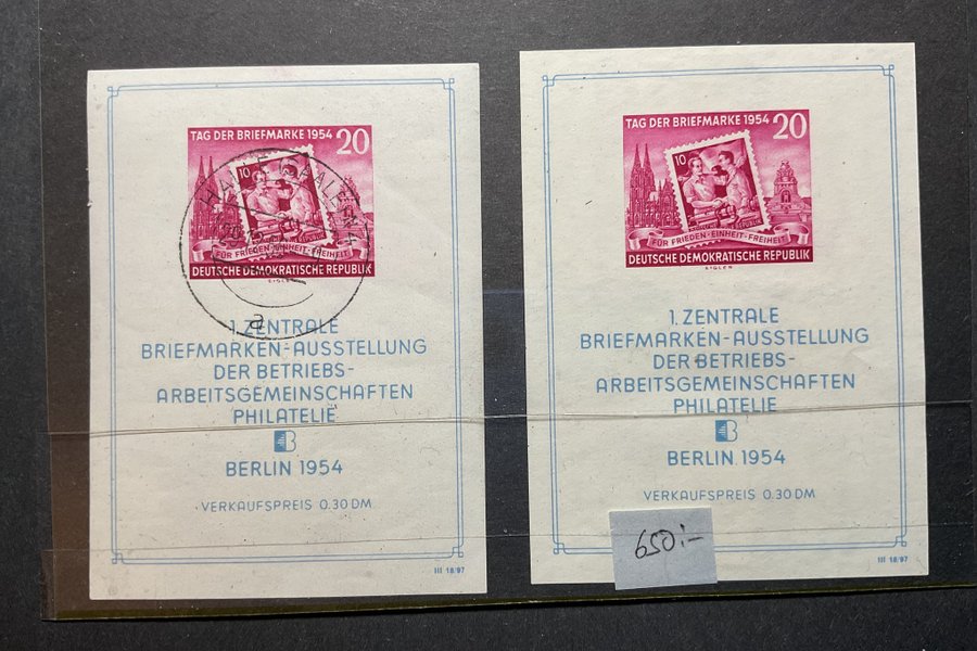 Ett ostämplat (spår av fs) & ett stämplat block nr 10 från DDR 1954