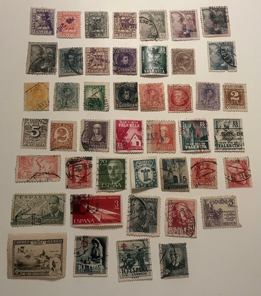 Här har du en betydligt äldre Spanien-samling än de tidigare — många från ca 1900–1940-tal (kung Alfonso XIII, republik, tidig Franco, lokalutgåvor m.m.). Det är faktiskt den mest intressanta Spanien-lotten du visat hittills.